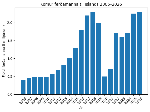 Samkvæmt tölum frá Ferðamálastofu og Isavia voru komur erlendra farþega til Íslands um 2,25 milljónir árið 2025, miðað við skráningar frá Keflavíkurflugvelli, sem telur yfir 99% af allri alþjóðlegri farþegaumferð til og frá landinu.